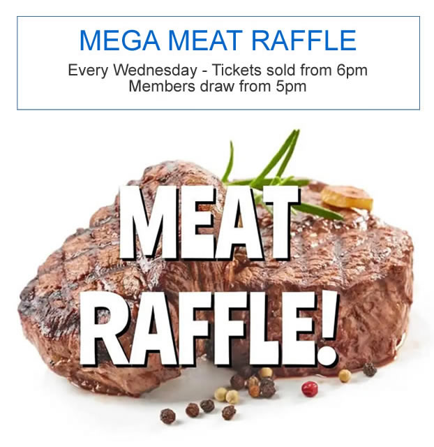 Mega Meat Raffle - Tickets sold from 6pm. Go in the draw to win the major monthly prize which is drawn on the last Wednesday of the month.